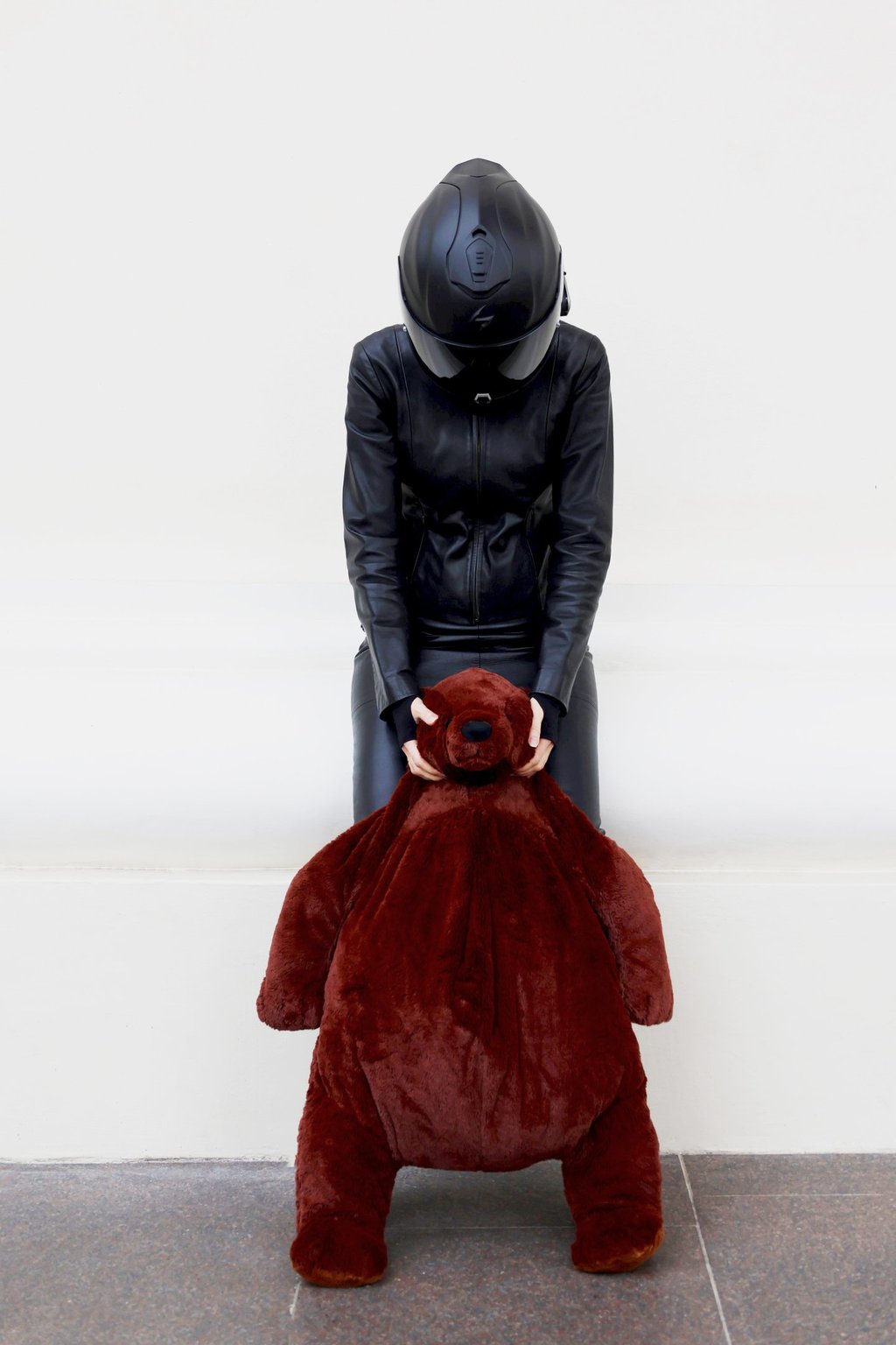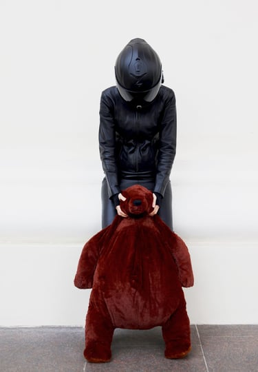 The motorcycle helmet and precise lines symbolize control, while the teddy bear, playful gestures, and bursts of colorful disorder reveal the inner child and the slow path toward freedom, authenticity, and the joy of simply being oneself.