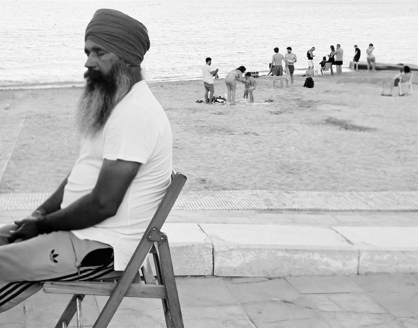 A Sikh man meditates quietly as life continues around him on an Italian beach.