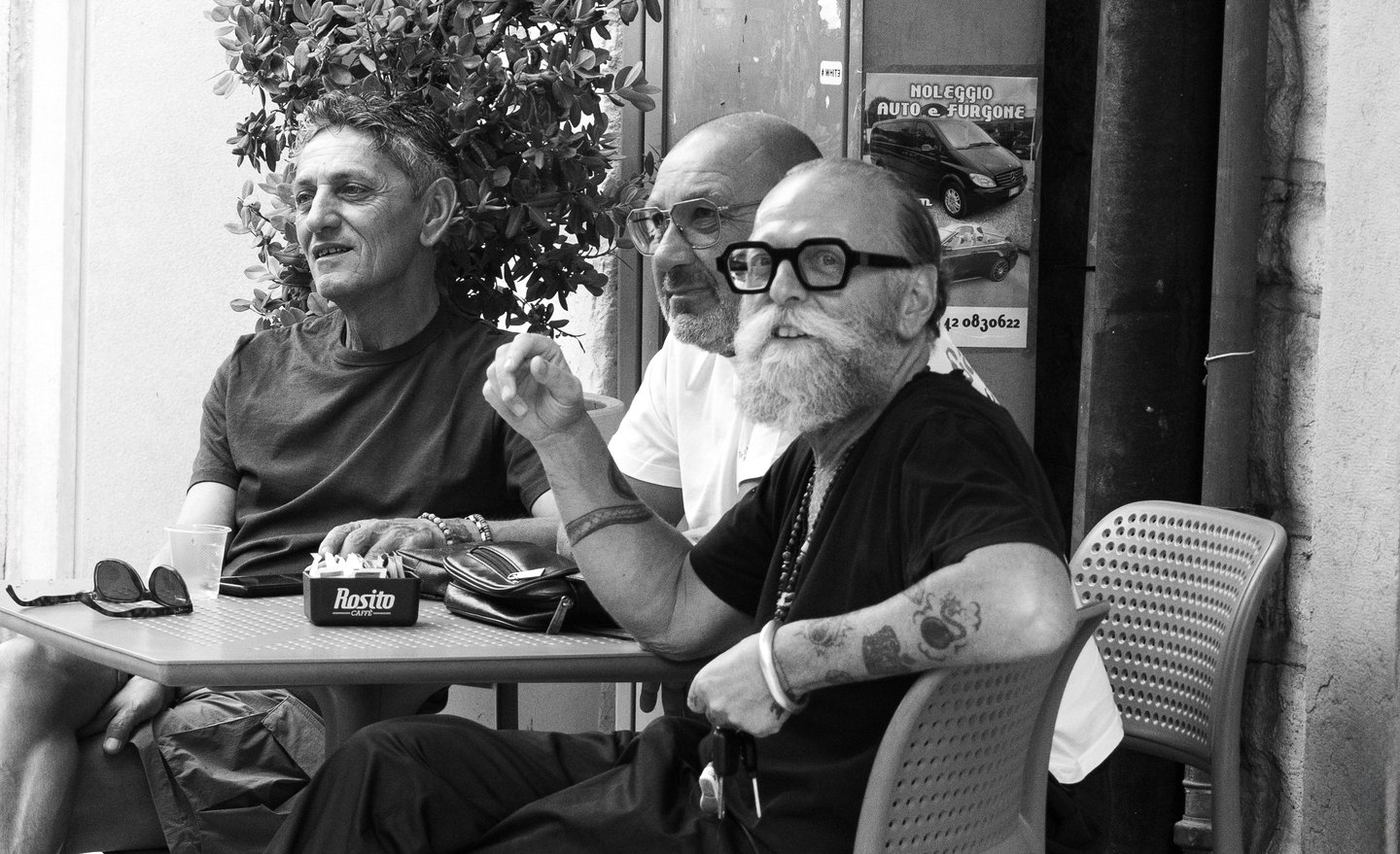 Three men at Rosito Caffè, their tattoos, expressions, capturing the essence of Italian street life.