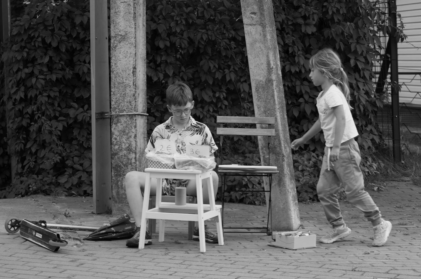 A young boy sells on a Vilnius street, focused and determined, while life passes by around him.
