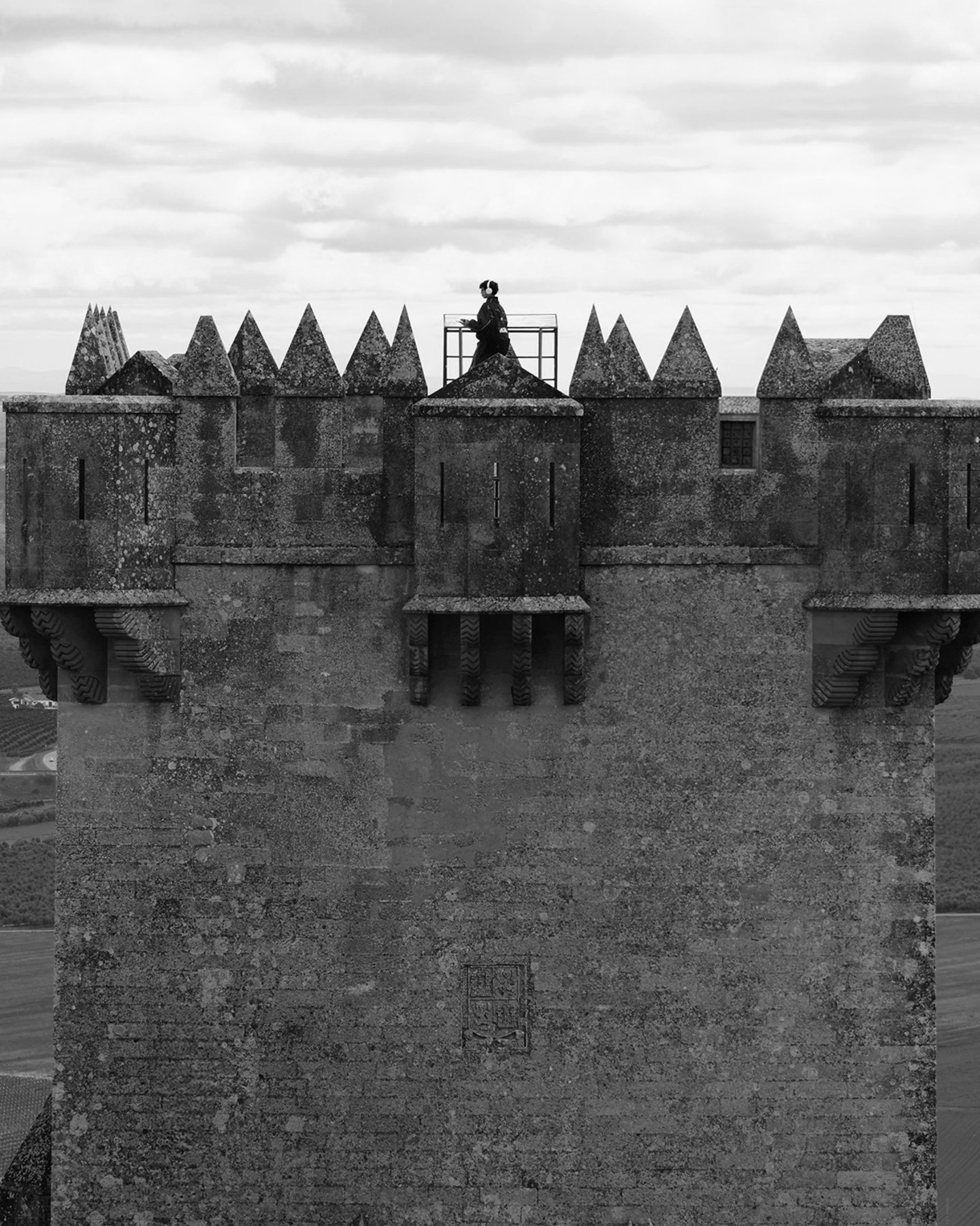 A lone figure with headphones walks along a medieval castle tower, where history meets the present in quiet stillness.