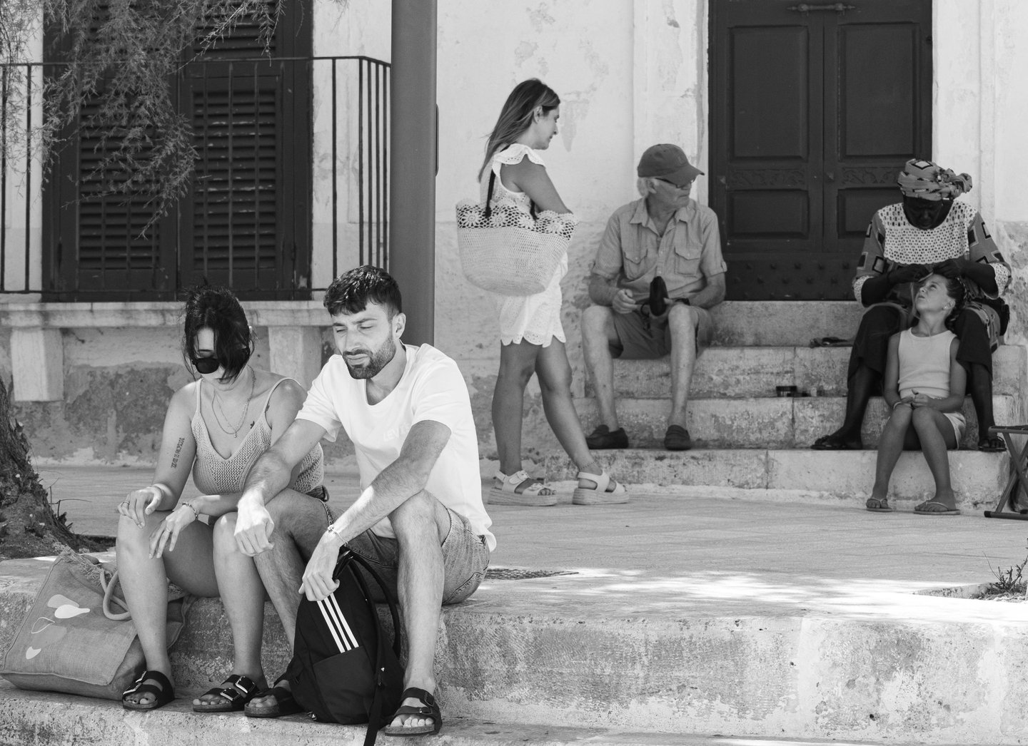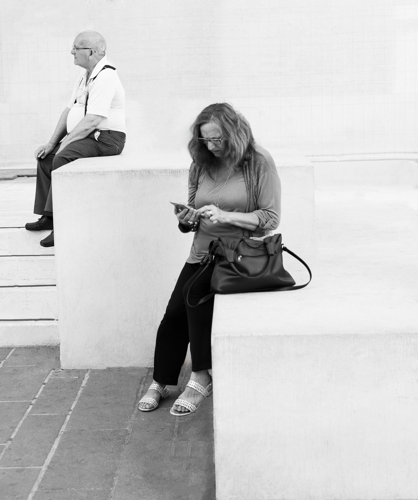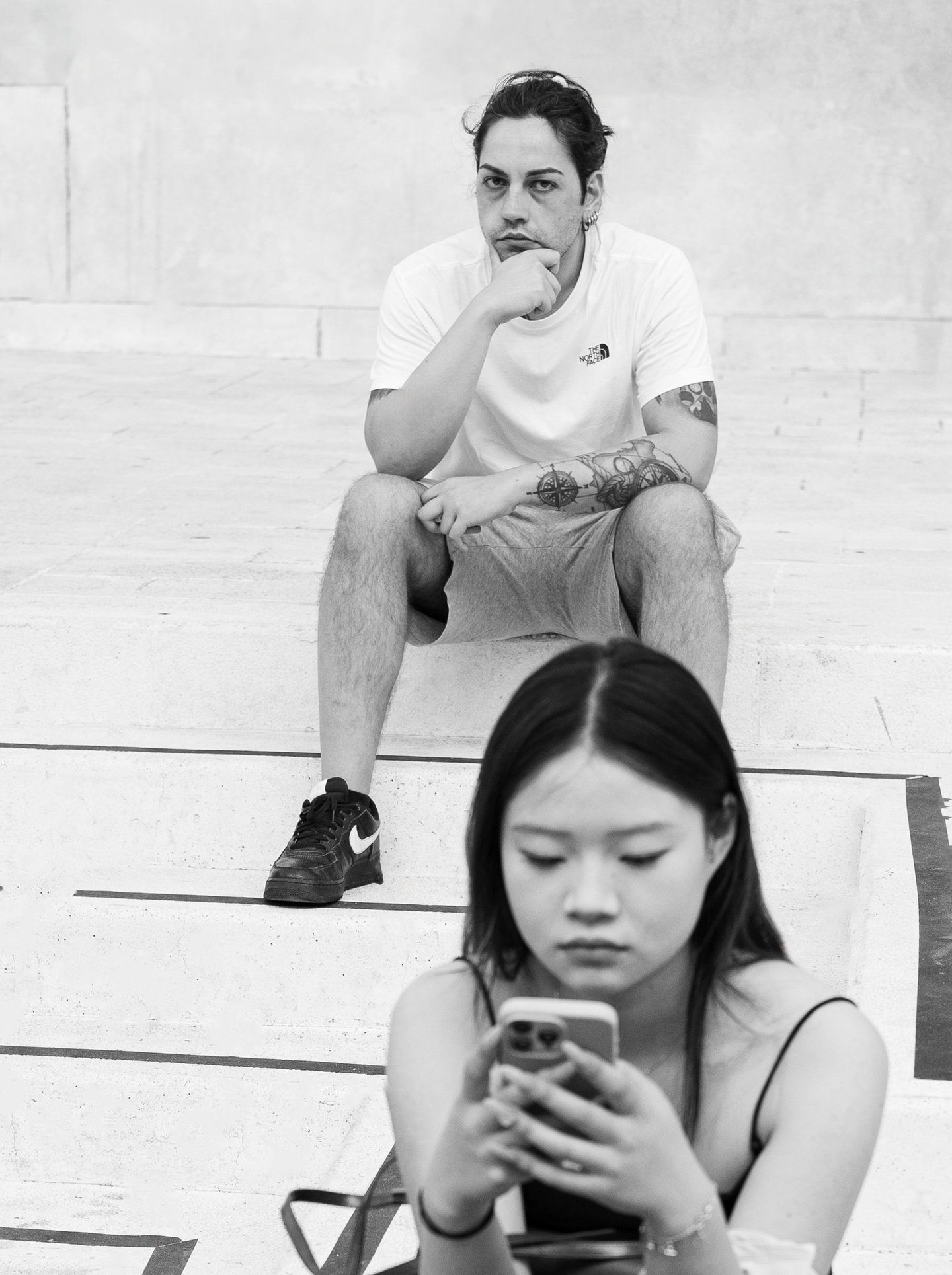 Man locks eyes with the camera as she scrolls on her phone—two lives, one street.