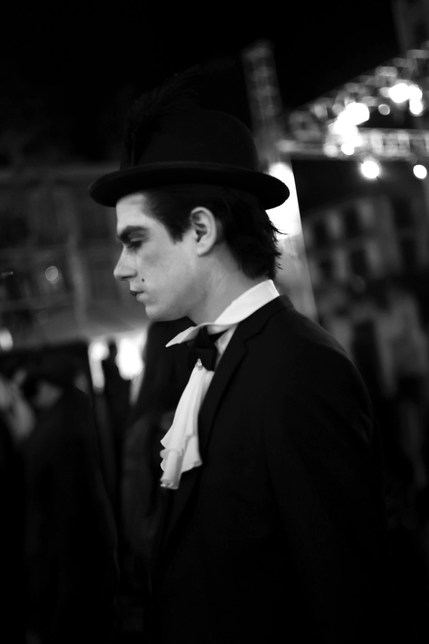 In the middle of the night crowd, he carries his own private world — theatrical, unreachable, completely himself.
