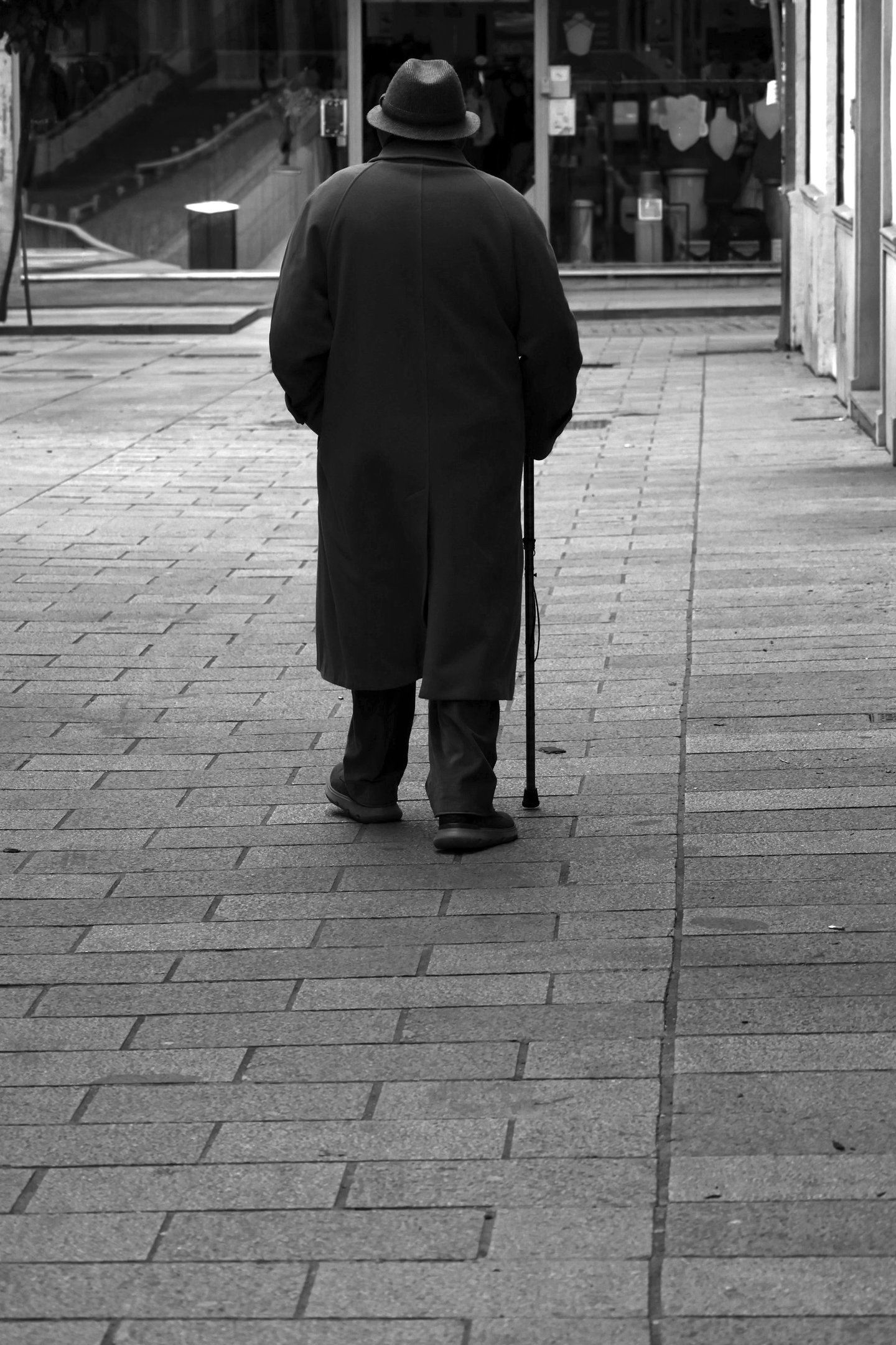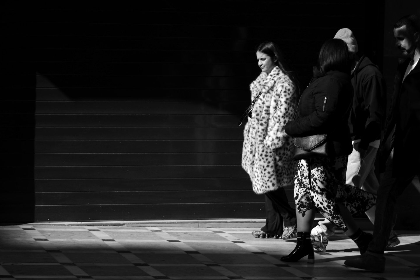 A woman in a leopard coat emerges from shadow, lost in her own world.