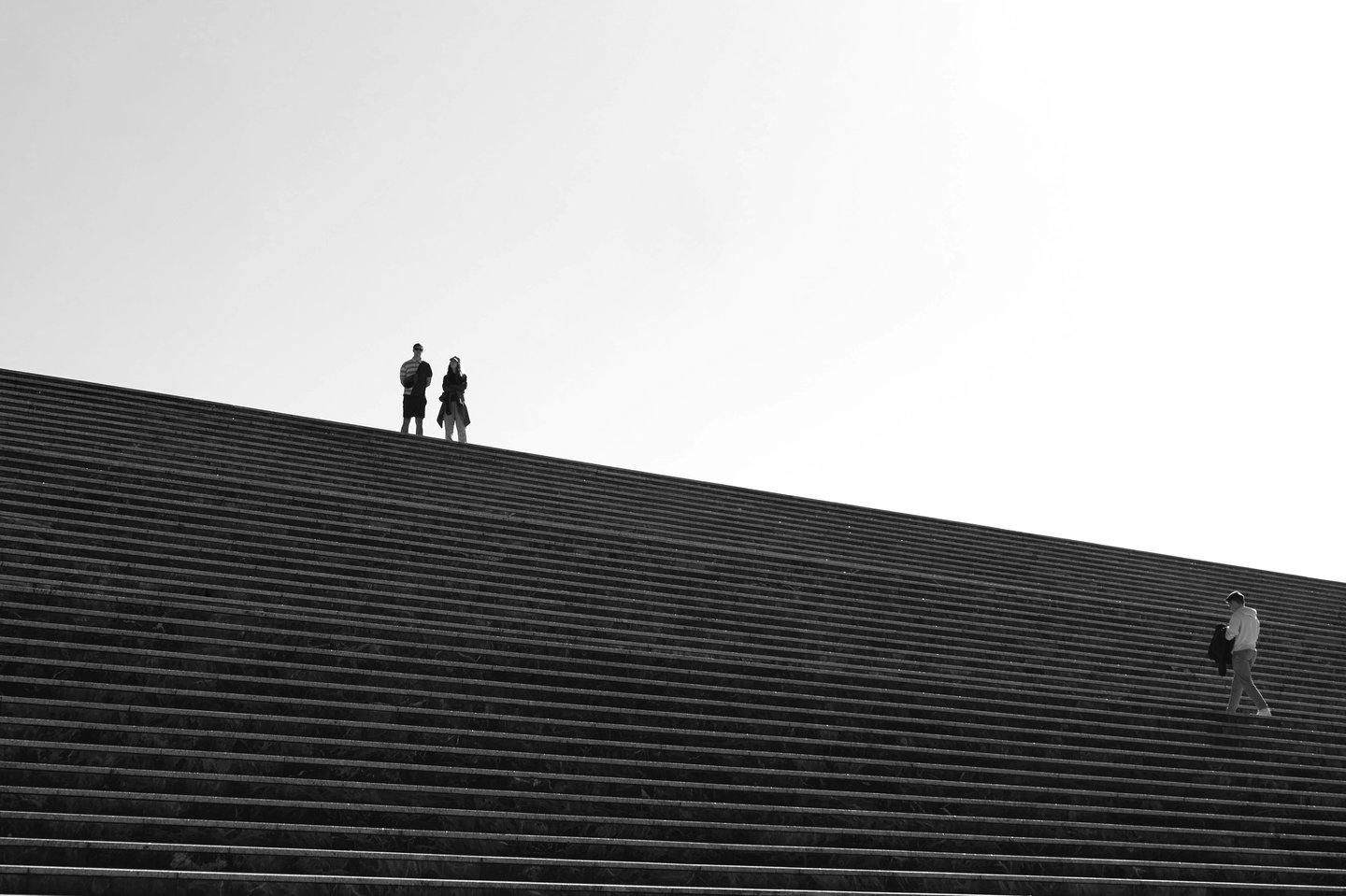 Tiny figures on a vast staircase, their smallness accentuating the monumental scale and boundless emptiness around them.
