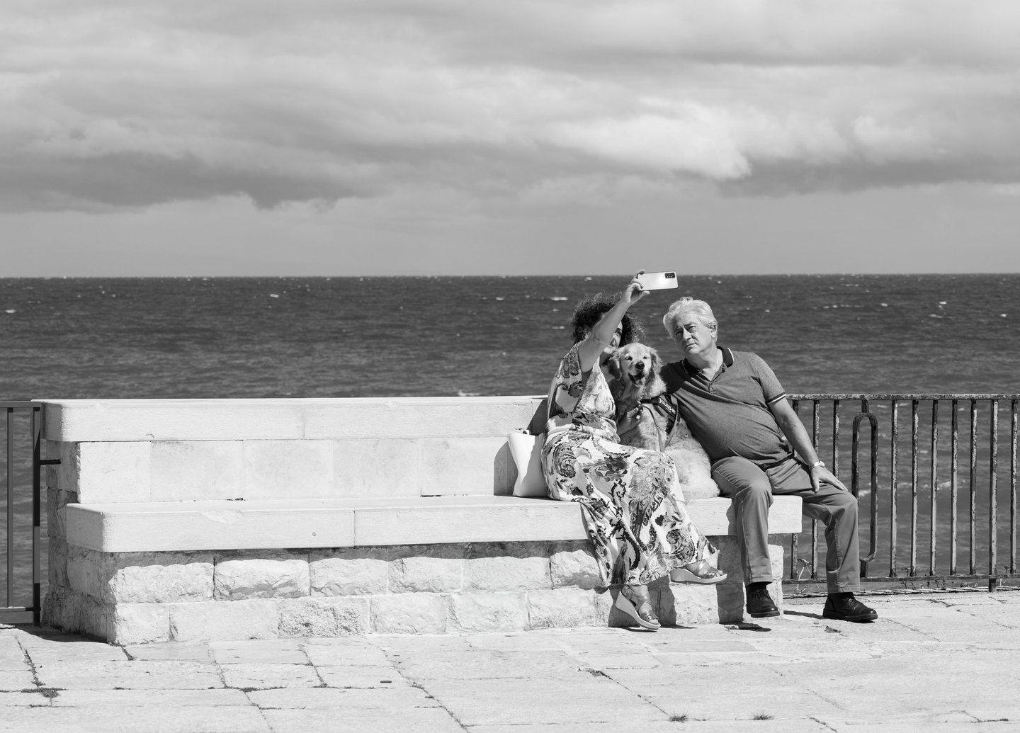 She poses with their dog, dad is nearby — a fleeting story by the shore.