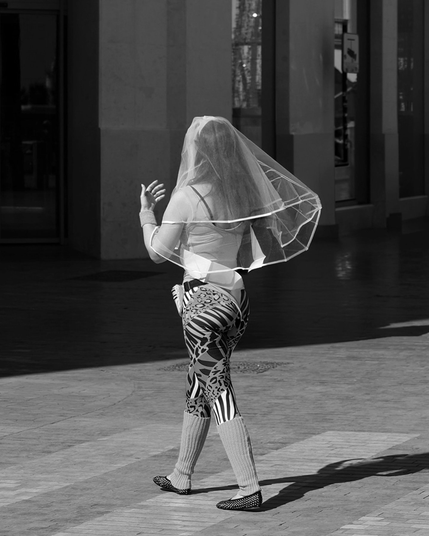 A veiled bride in animal print leggings walks away, city streets as her stage.