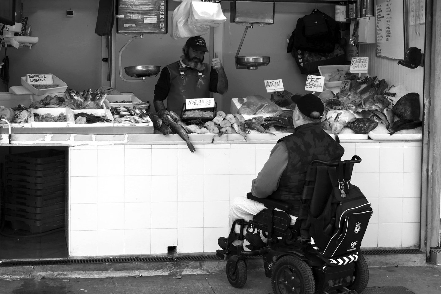 A man in a wheelchair buys fish, blending into the Spanish market’s everyday rhythm.